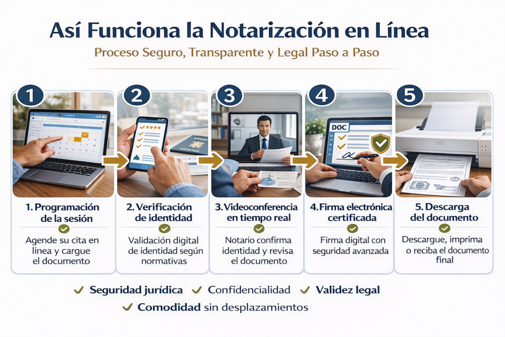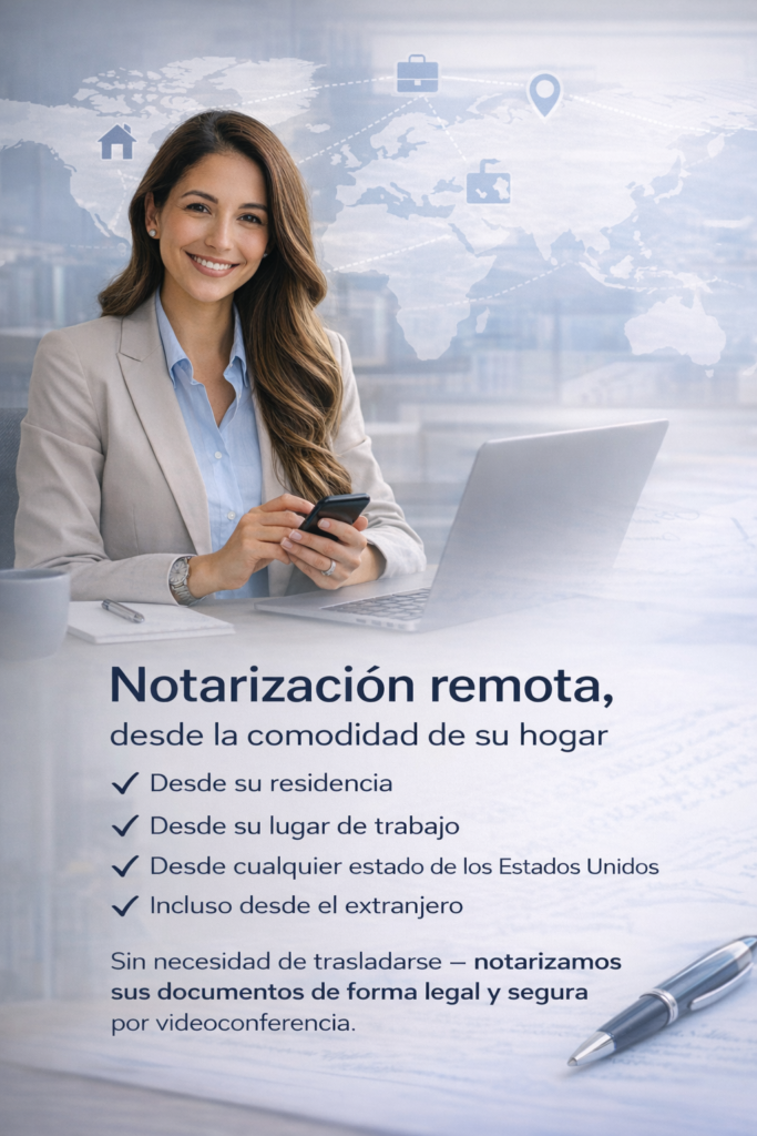 La notarización remota en línea representa la evolución moderna del servicio notarial. Mediante tecnología segura y plataformas certificadas, es posible firmar y autenticar documentos a través de videoconferencia, manteniendo plena validez legal conforme a la normativa vigente.